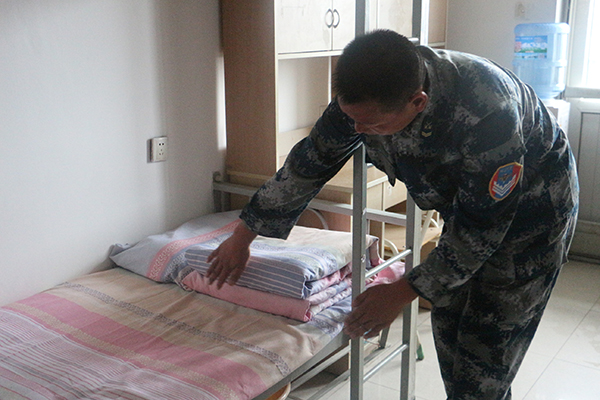 各宿舍长在之前已经接受了教官事无巨细的内务培训,并且用本子记录了内务整理的注意事项,用手机拍下了标准宿舍的样式。我院每个宿舍的小葡萄都在各自舍长的带领下井然有序的整理着。枕头、被子、军装在床上各居其位、立定站好,拖鞋、便鞋、脸盆在床下向右看齐排列成行。床单平整如无波水面,桌面整洁如戈壁沙滩。扫地、擦地、叠被子、摆水壶,小葡萄们互帮互助,忙的不亦乐乎。大家都在努力为自己和室友创造着更整洁、更舒适、更有军队作风的生活环境。