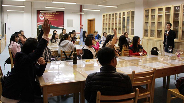 潘星伯同学介绍了品尝及盲品的相关基础;根据葡萄酒产地划分,分别为大家讲解全球各大主要葡萄产区的葡萄与葡萄酒在酸度、澄清度、口感及色泽等鉴赏指标上的特征;在品尝的实践中教大家鉴赏葡萄酒的基本步骤;并和同学们对品尝室现有酒杯的用途与特点进行讨论。