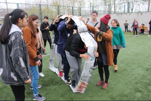 活动以抽纸牌的形式将同学们随机地分为四组,小组成员围坐在一起,首先是自我介绍的环节,大家互相介绍自己、互记姓名,无形之中熟悉了对方,拉近了成员间的距离。接下来正式的游戏环节开始。第一个项目是垫排球、跳长绳接力,每组出12人,5人垫球,垫到一定数值后,另外的7人开始摇绳、跳绳,此活动让队员们思考各种巧妙方法去完成任务,比如垫球方式和高度的调整,同时跳长绳环节的“牵一发而动全身”也锻炼了队员间的团队合作能力。之后对垫底队伍的“惩罚”也是别出心裁,一名队员站在桌上向后倒,另有6名队友在他身后伸手接人,是对同学们相互间信任的考验,也增加了团队凝聚力。之后的“报纸环竞走”环节考验了同学们的动手能力与配合分工能力,不知不觉间,团学各部门成员已然融合成一个大集体。最后,翻纸牌游戏让现场气氛达到高潮,小组之间展开了体力和脑力的角逐,大家你来我往,争相按照顺序翻出正确的纸牌,不仅仅是一个游戏,更考验了成员的协作精神和默契配合。四轮游戏之后,“一股清流”小组凭借930.4秒的成绩获得第一名。