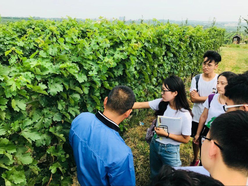 上午九时许,调研团抵达君顶酒庄。师兄钟晓敏先生热情地接待了调研团,随后便开始带领我们来到葡萄种植园进行参观与学习。葡萄园占地面积1000余亩,种植着赤霞珠、梅鹿辄、西拉、泰纳特、霞多丽、小芒森等国际知名品种葡萄。师兄带领我们分别参观了赤霞珠、美乐、霞多丽葡萄园区。师兄介绍到,由于气候等因素的限制,蓬莱地区不适宜赤霞珠等红葡萄品种的生长,因此即便目前酒庄内赤霞珠种植面积较大,但数年后也将被更适于当地气候的其他葡萄品种取代。关于葡萄园正在进行的标准化建设,师兄说这是为了更好地进行机械采摘,节省时间与人力成本;而滴灌的建设则是为了防止葡萄受旱,同时使水资源得到最大化利用。