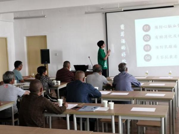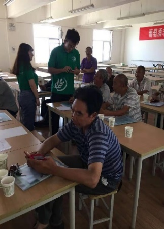 第二步,丰富技术培训内容,穿插品酒花絮,安排大学生队员潘禹竹同学主讲葡萄酒品鉴知识,她是葡萄酒WSET二级品酒师,寓教于乐,让果农学习品尝干白、干红葡萄酒,感受品酒的美好生活,拉近与果农认识过程,品酒交朋友,小队努力建立扶贫攻坚调研队第一核心朋友圈,随时随地与果农交流。第三步,带队杨和财老师宣讲本次合阳扶贫攻坚调研的意义和安排,并以发放问卷、需求单、聊天等形式,零距离摸底果农的需求,并建立微信群以便果农以后提问。在建立微信群的时候,几位农户因不擅长使用微信,不知道如何加入,小队成员热情的帮助农户加入了微信群,并解答了农户在问卷上存在的问题。