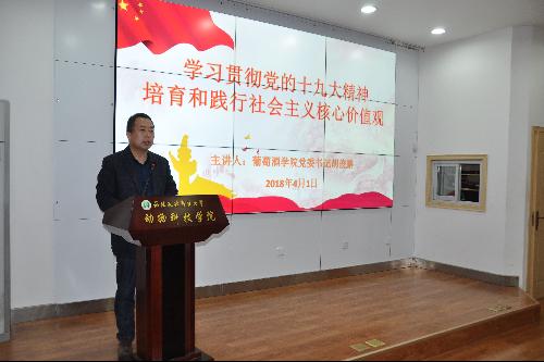 开班仪式结束后,胡俊鹏带领学员进行第一次线下理论学习《学习贯彻党的十九大精神培育和践行社会主义核心价值观》。对于当代大学生如何践行社会主义核心价值观,他谈到一是坚持马克思主义的指导思想,用马克思主义中国化的最新理论成果武装当代自己。二是用习近平新时代中国特色社会主义思想共同理想凝聚力量。 三是培育和弘扬以爱国主义为核心的民族精神和以改革创新为核心的时代精神,使大学生时刻保持昂扬向上的精神状态。