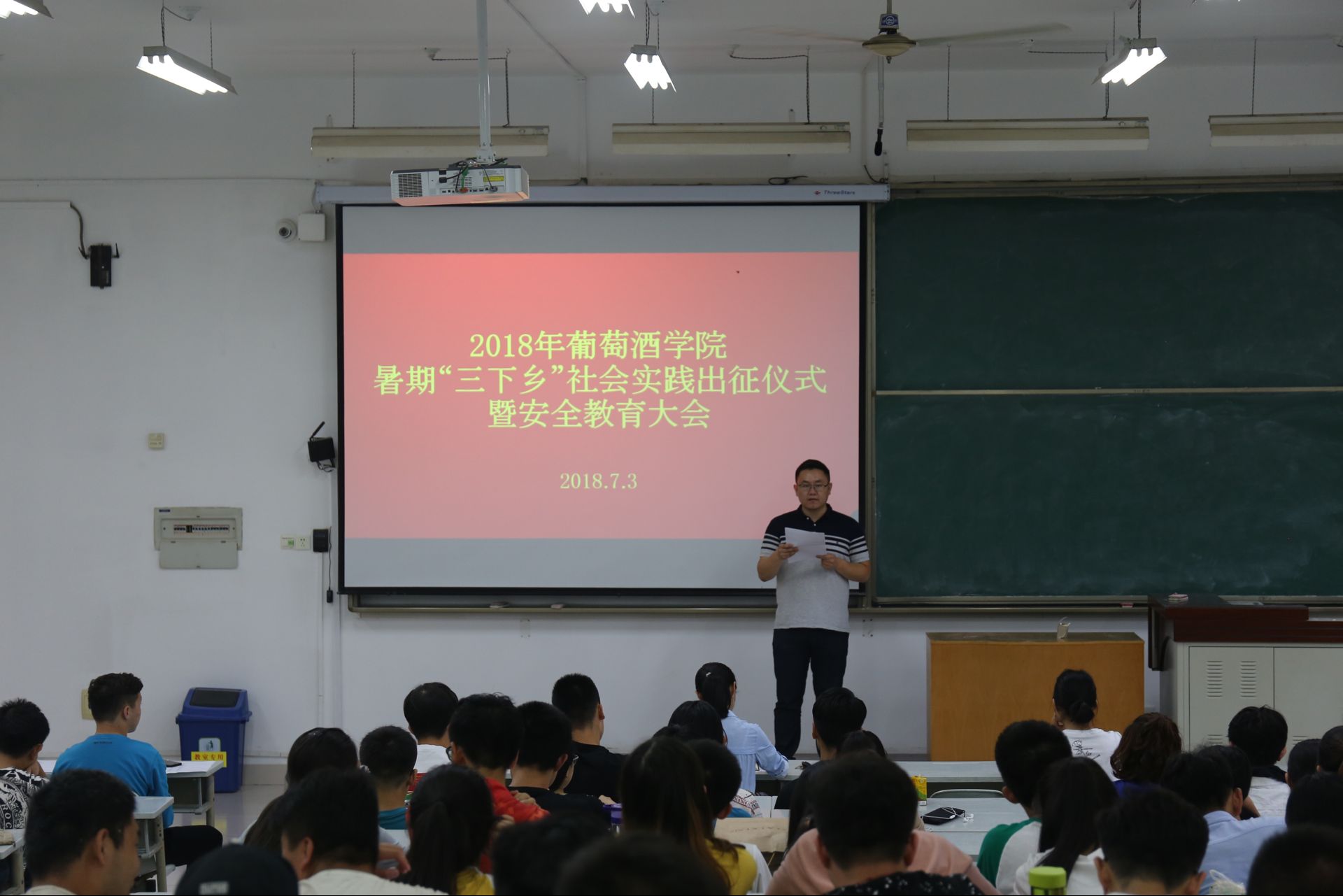 举办2018年大学生暑期“三下乡”社会实践活动出征仪式暨安全教育大会。党委副书记邓亚丽,分团委书记赵星宇,辅导员朱美蓉以及全体暑期“三下乡”社会实践团队成员参加大会,会议由赵星宇主持。