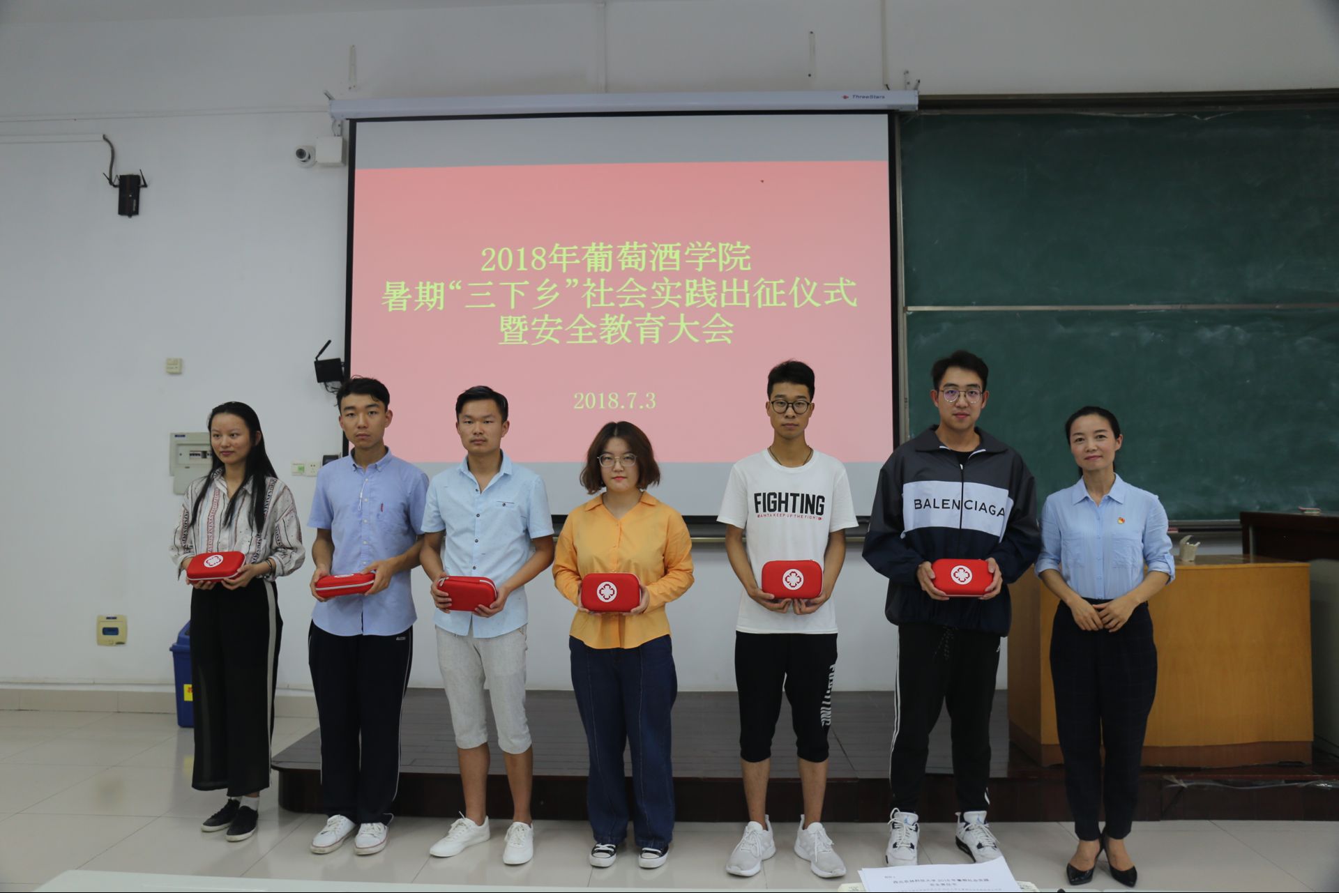 党委副书记邓亚丽老师贴心地为各队伍发放了医疗包后,对暑期社会实践工作提出四点要求,一是全面认识社会实践的重要意义。社会实践是了解社会、认识社会的重要途径,是专业学习和实践教育的重要组成部分,作为对实践能力有较高要求的葡萄与葡萄酒工程专业的学生,应抓住一切机会积极投身实践锻炼,通过实践了解社会、认识专业、成长自我。二是做足行前“功课”,提高实践项目执行能力。每支队伍在出发前结合各自实践目的和要求,按照“科学谋划、目标管理、信息在线、过程控制”的原则,细致做好资料查阅、人员分工、路线攻略、经费预算等工作,确保学校、国产精品