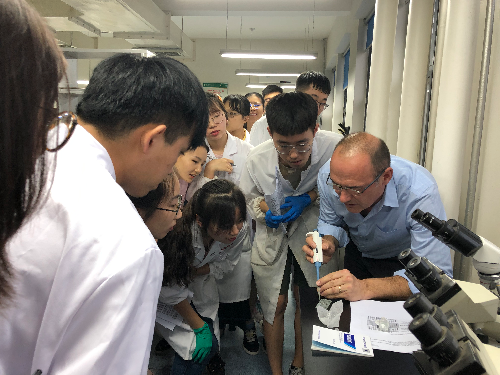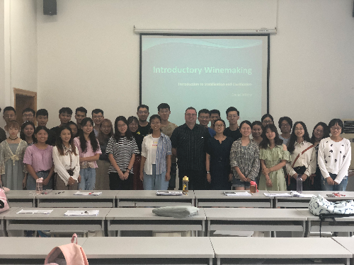 Jiranek教授主要从微生物角度诠释葡萄酒酿造的微生物学基础及发酵原理,教授了酵母菌的特性、硫代谢、氮代谢、酒精发酵及其副产物,他同时结合小容器苹果酒发酵比较了3株非酿酒酵母与酿酒酵母的发酵特性,加深了同学们对酵母参与的酒精发酵的理解。Jeffery副教授则着重从工艺学角度介绍了葡萄酒中蛋白质、酒石酸盐及颜色的稳定性和葡萄酒稳定、澄清的方法。两位教授在授课过程中都穿插讲解了酵母及葡萄酒稳定与澄清方面的最新研究进展和学科前言。