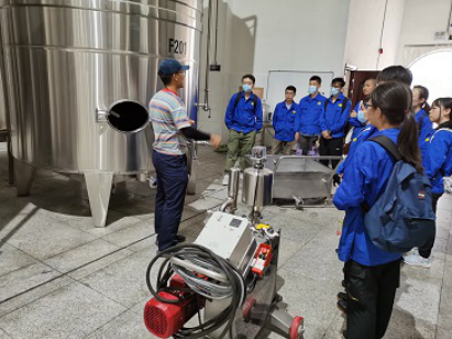 早上八点半,在开完“碰头会”后,生产实习分为两组,一组同学与酒庄员工在发酵车间进行温度和比重监测、打循环、品尝等日常发酵管理;另一组同学进行了前处理车间、储酒车间卫生打扫。特别地,在带队老师的倡议下,同学们进行了寝室内务整理和楼宇卫生大扫除,用干净整洁的面貌和轻松愉悦的心情迎接“双节”,在劳动中体会服务他人、奉献集体的快乐。